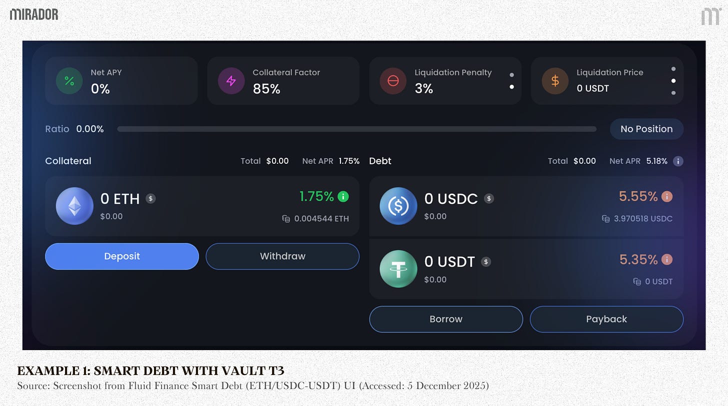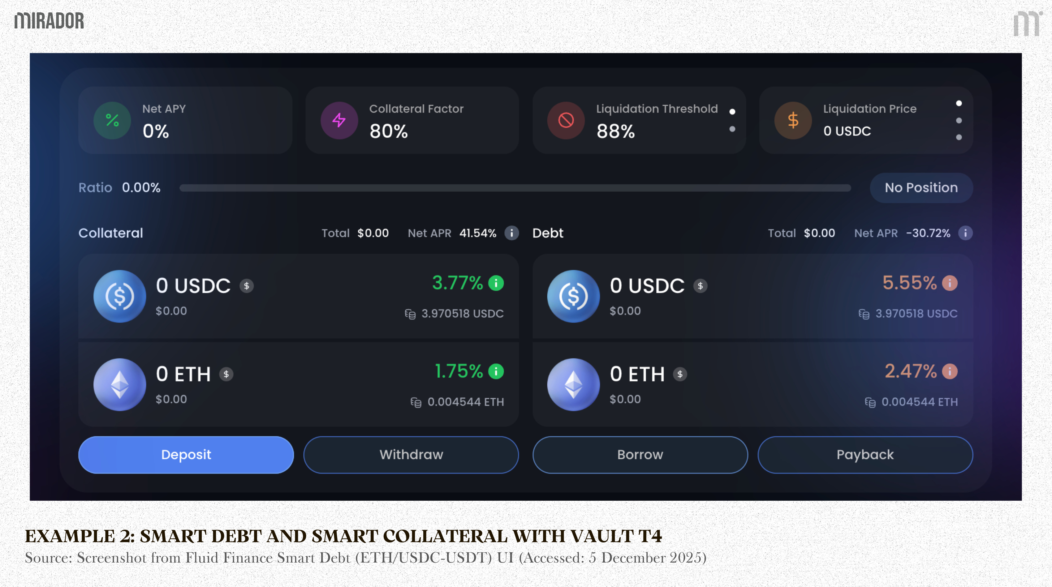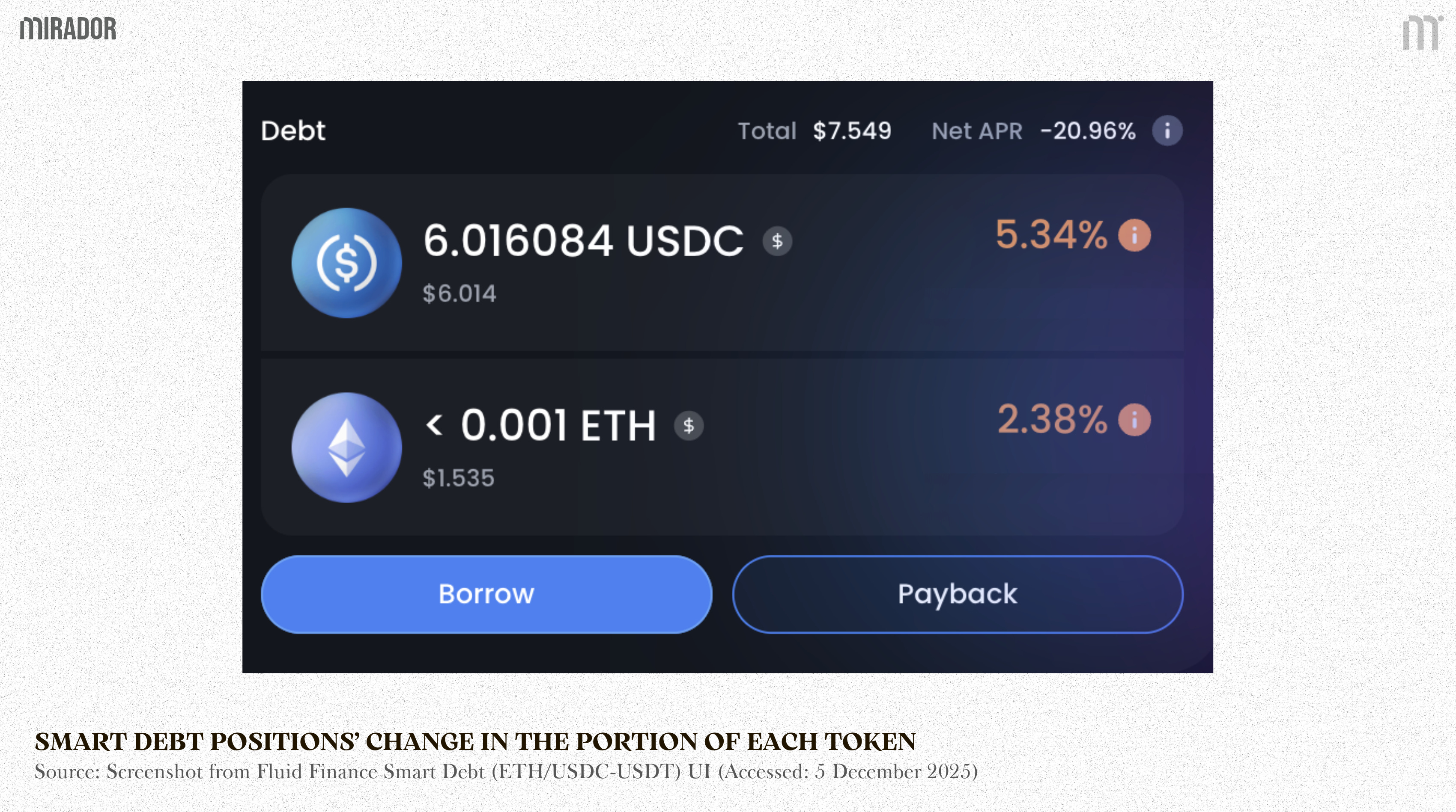 Because all user interactions happen through these shares, Smart Debt also earns a proportional portion of trading fees, just like Smart Collateral. This allows borrowers to benefit directly from DEX activity: trading flow can offset part of their interest costs, and in high-fee environments, even create net-positive borrowing conditions.
