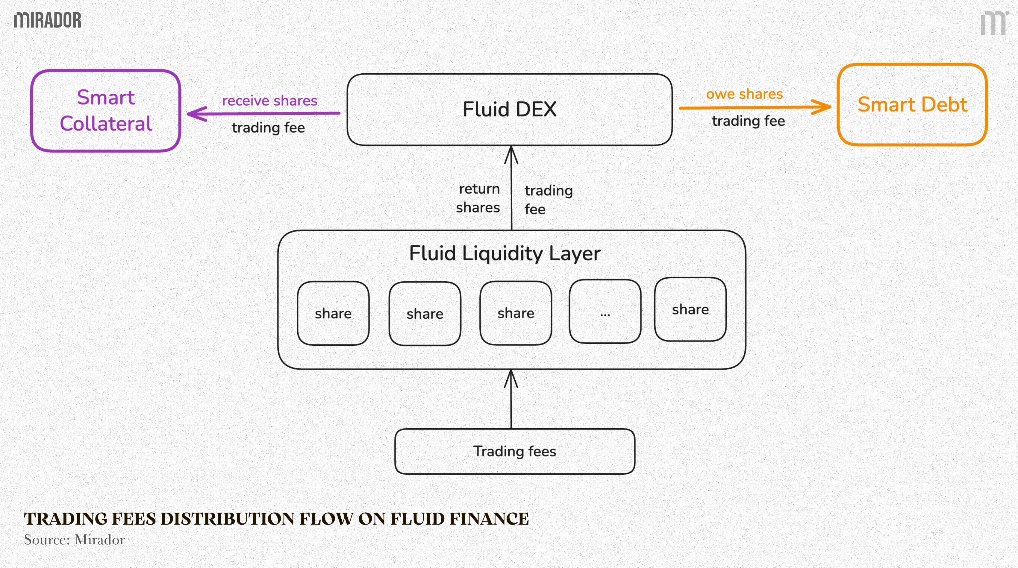 Smart Collateral (supply 2 tokens) makes depositors become liquidity providers (LP) of Fluid DEX, they receive their shares of Fluid DEX (representing their deposited portion), and in the same way, Smart Debt (borrow 2 tokens) also means owing Fluid DEX’s shares (representing their borrowed portion).