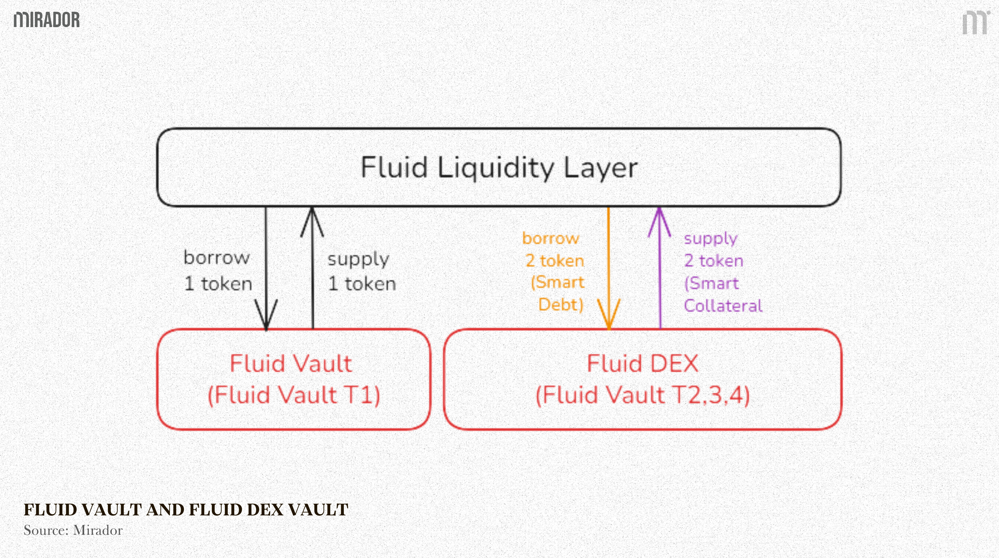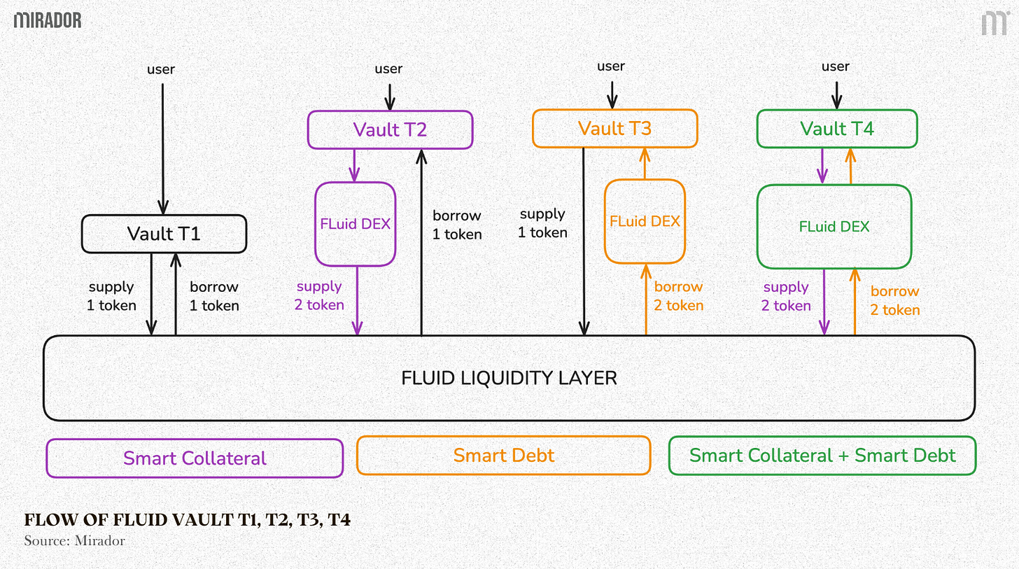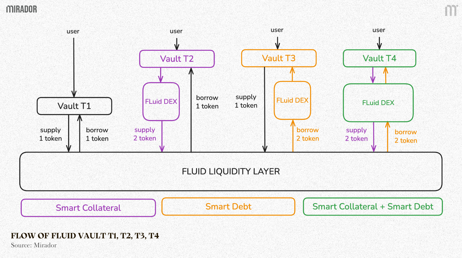 To enable DEX-on-lending mechanism, Fluid has 3 kinds of vaults for Fluid DEX. While Vault T1 is used for regular lending and borrowing (supply and borrowing single tokens), in Fluid DEX, we have: