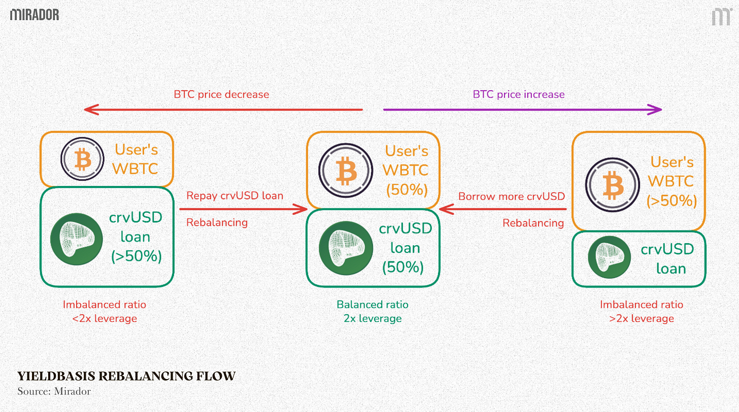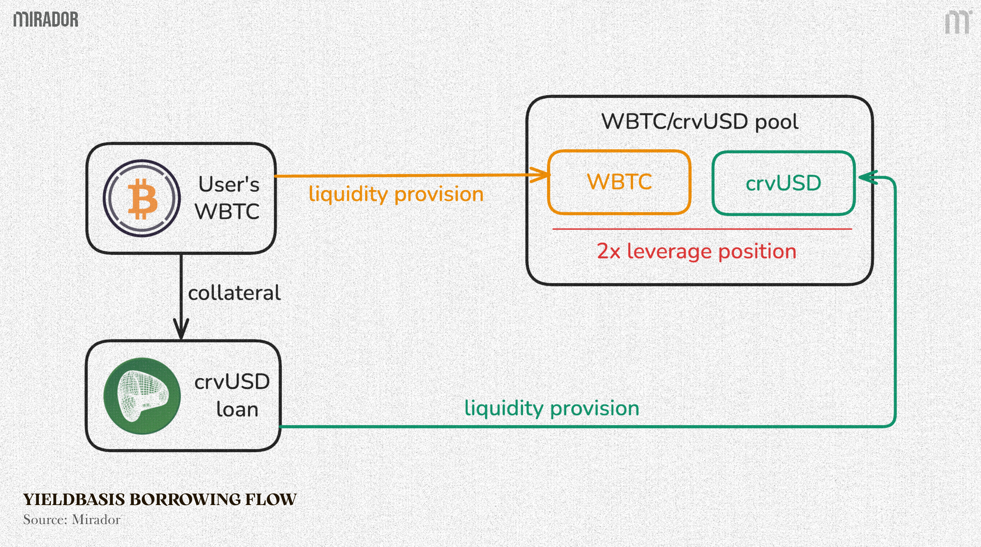 YieldBasis makes an LP position move 1:1 with BTC (eliminating impermanent loss) by pairing WBTC with borrowed crvUSD and maintaining a constant 2× compounding leverage.