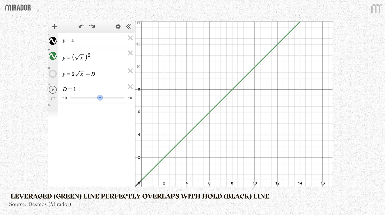 In other words, the leveraged (green) line now perfectly overlaps with the hold (black) line. The position behaves exactly like simply holding the asset.