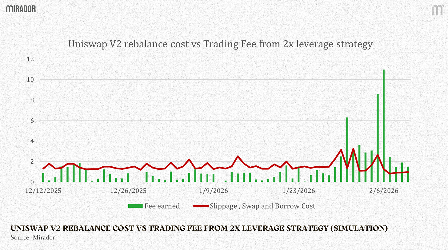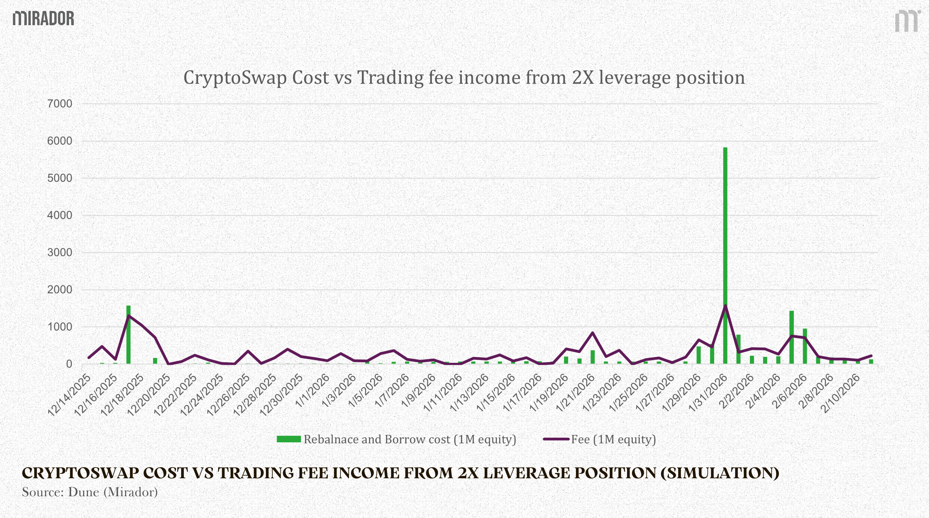 In most market conditions, the cost of borrowing stablecoins and constantly maintaining a 2x position is higher than the extra trading fees earned from using 2x leverage.