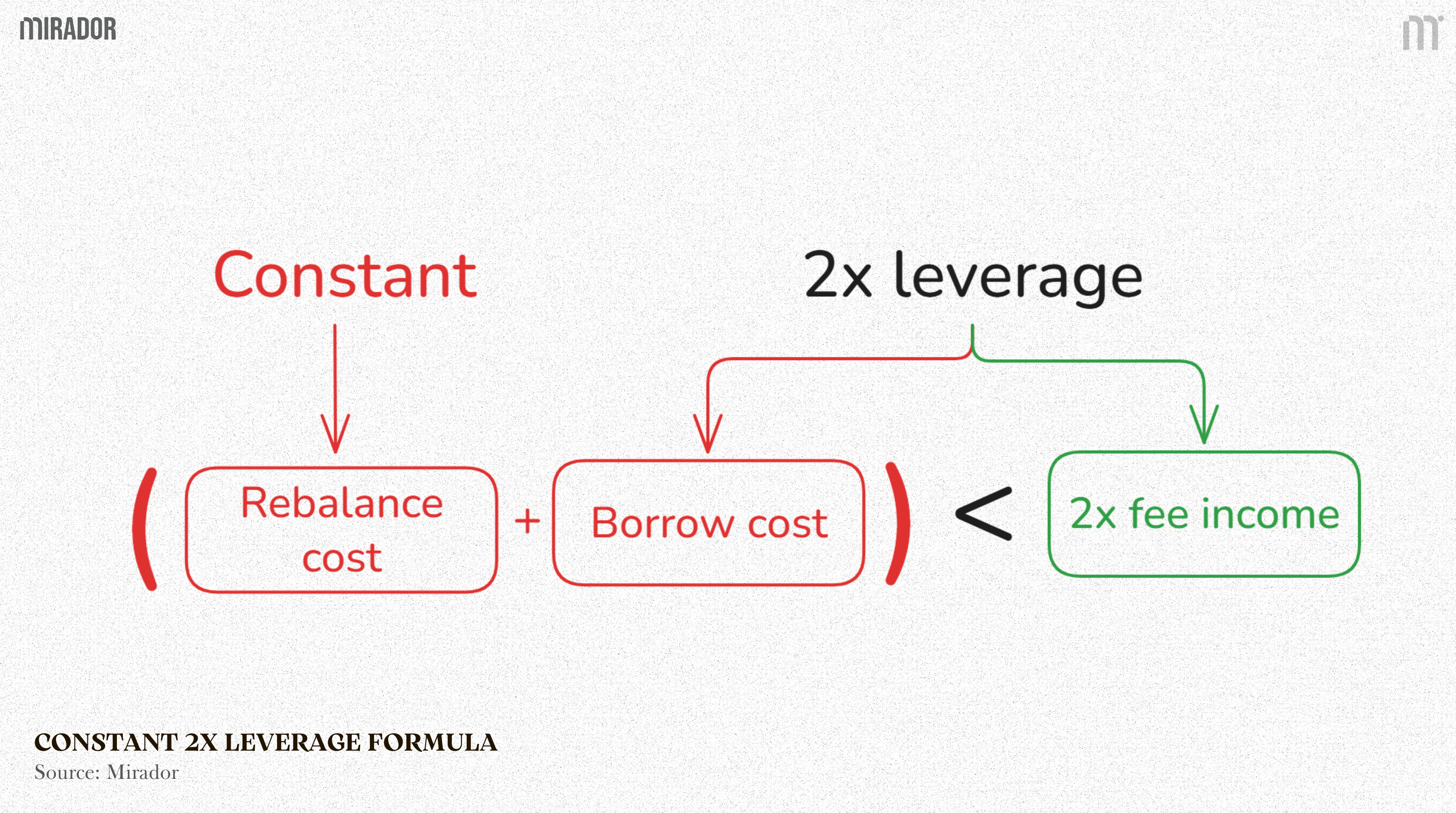 For the majority of days, trading fees from the 2x position exceed the combined rebalancing and borrowing costs. This means the strategy is generally net positive under normal volatility and volume conditions.
