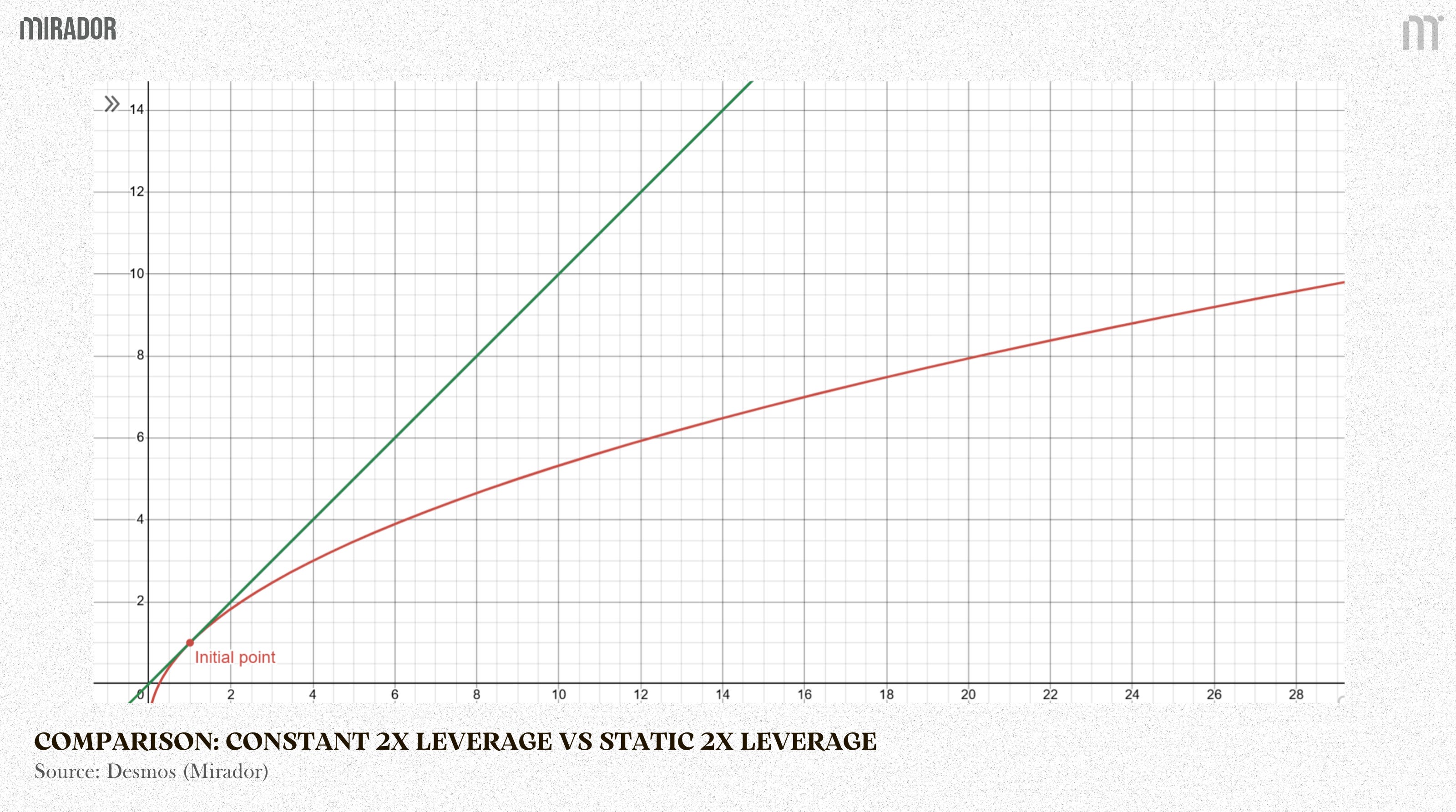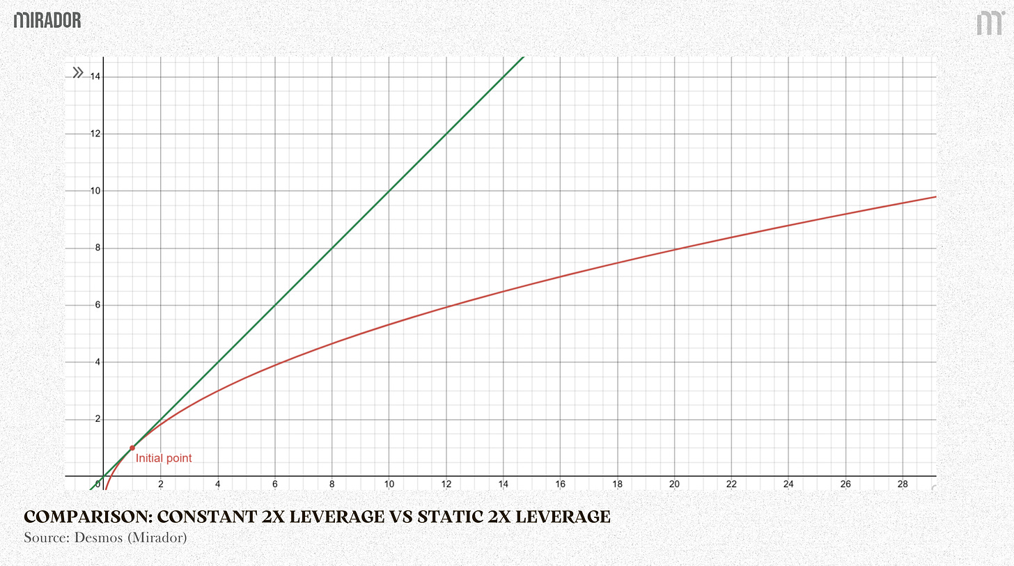 In other words: Static 2× leverage (which we have discussed before) just doubles your initial exposure, while constant 2× leverage keeps your price responsiveness fixed at 2×: