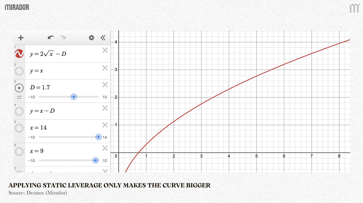 Applying static leverage (for example, 2×) only makes the curve bigger, can not change its shape