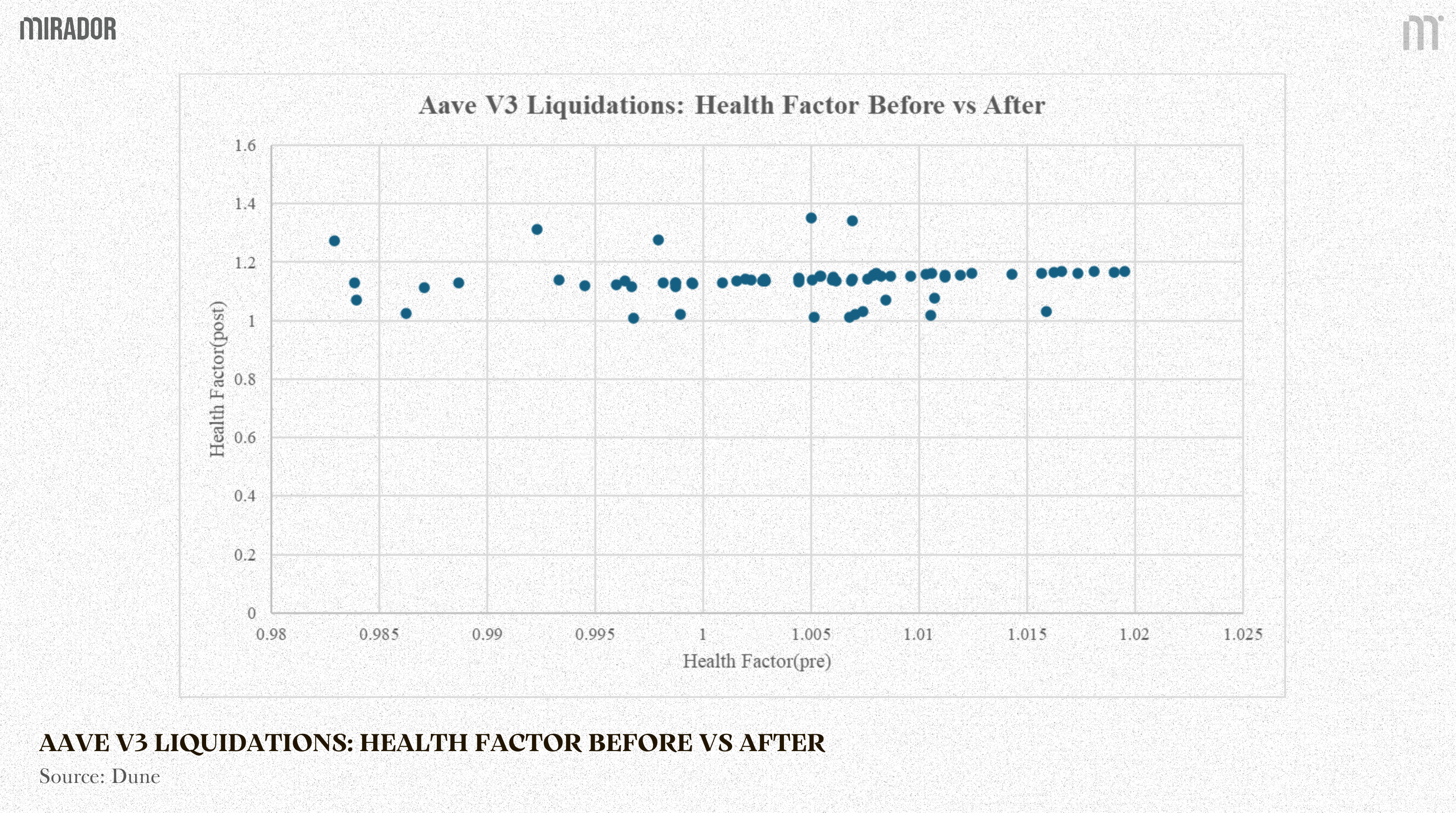 To test whether overshoot is a rare edge case or a recurring pattern, we analyze liquidation events on Aave V3 Ethereum using Dune Analytics. The chart below compares the Health Factor immediately before and immediately after each liquidation event.