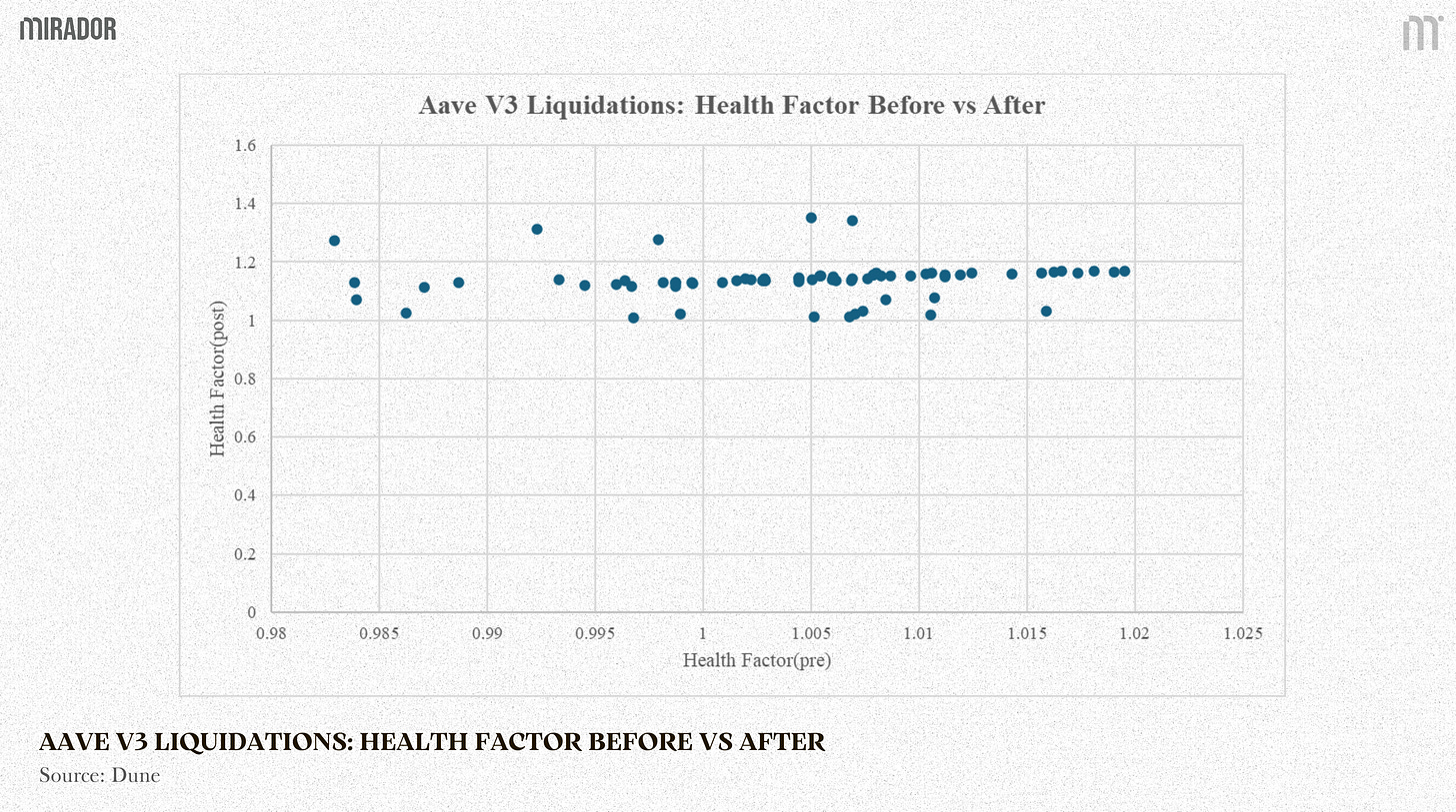 Interpreting the plot is straightforward. Points near Hpre≈0.99 represent positions that were only slightly below the liquidation threshold. If liquidation sizing were tightly calibrated, we would expect many of these points to land just above 1.0 after liquidation. Instead, a visible share of them jump to much higher post liquidation health factors, with many exceeding 1.12. In other words, the data suggests that a meaningful number of near threshold liquidations result in a post state that is substantially safer than the minimum required to exit liquidation.