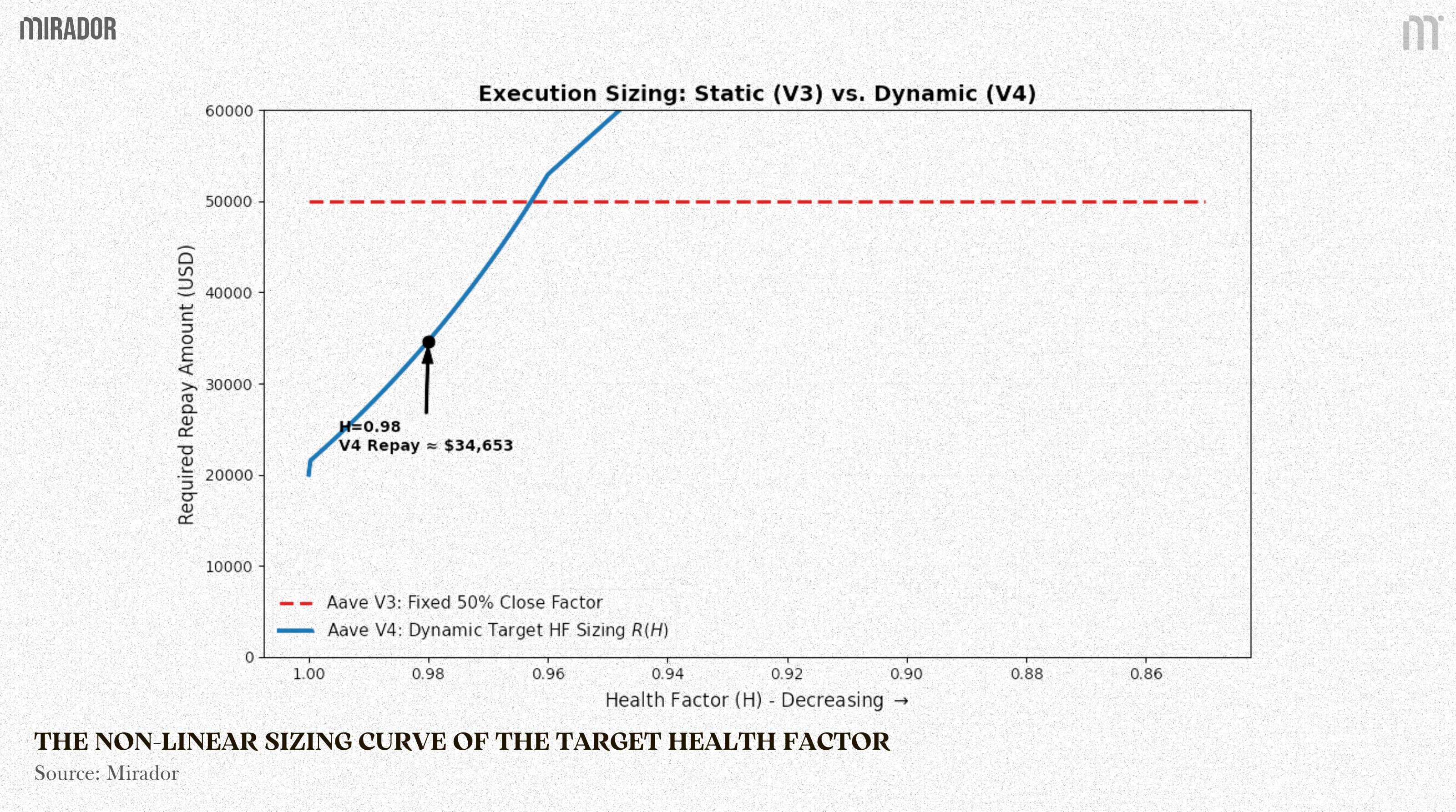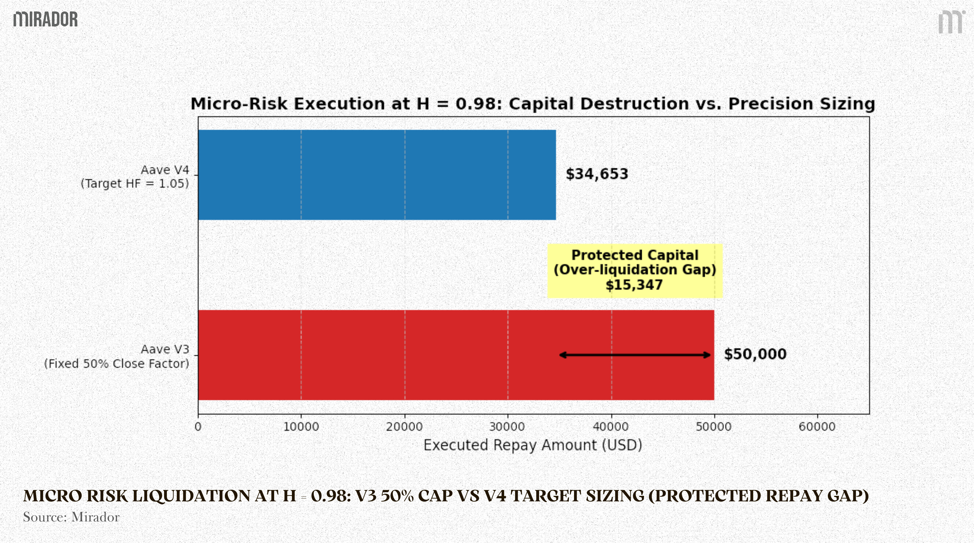 By embedding control theory mathematics into the core Smart Contract, the _calculateDebtToTargetHealthFactor function in V4 caps the required intervention at 34,653 USD. This provides direct technical proof that V4 utilizes the absolute minimum force necessary to secure the system, completely eliminating the excess capital destruction zone inherent to the legacy model.