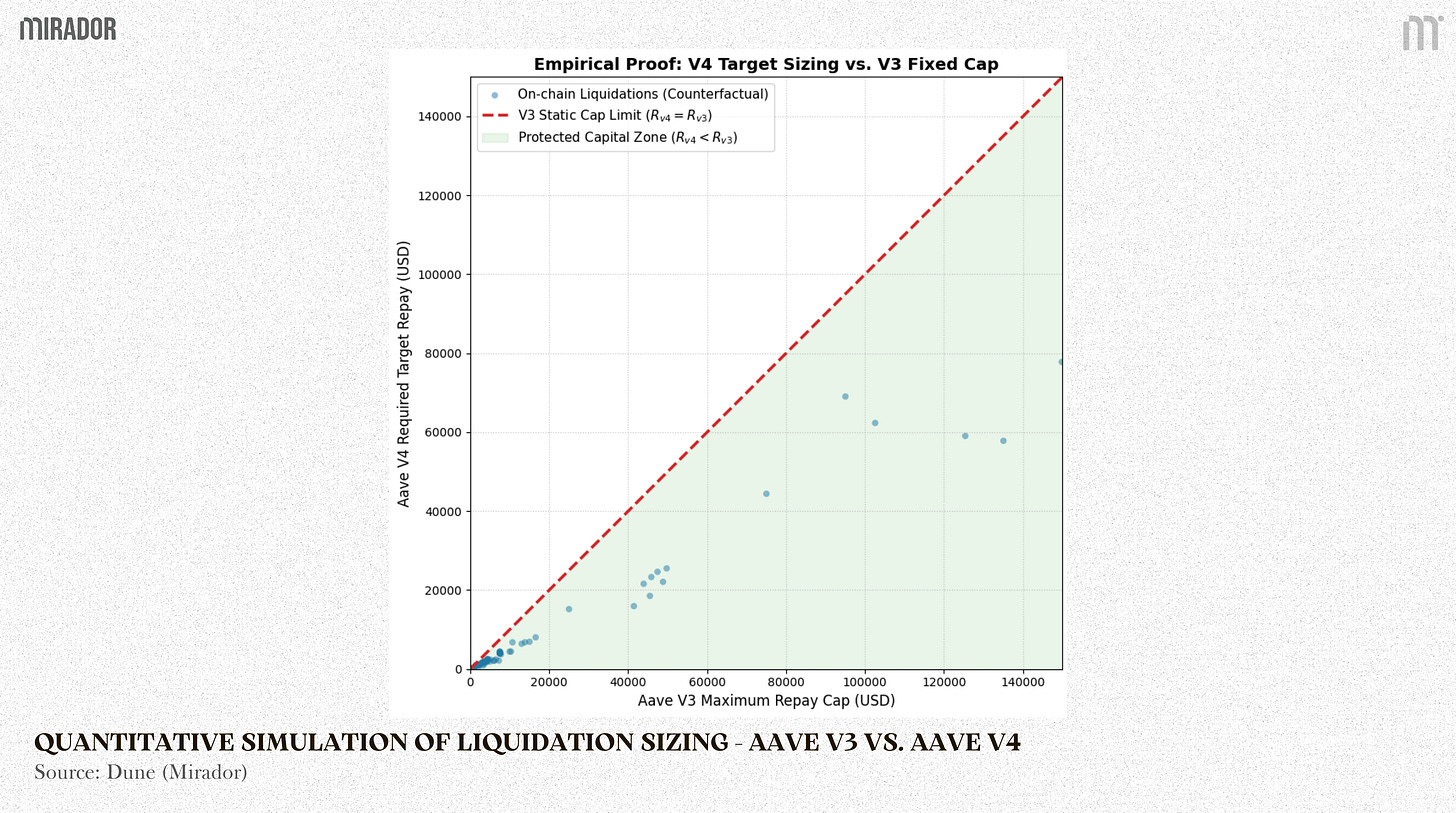The chart below reframes the same liquidation events through a counterfactual question: for each real Aave V3 liquidation, what repay amount would Aave V4 have requested if the position were liquidated using a Target Health Factor solver. Each dot is one on chain V3 liquidation event.