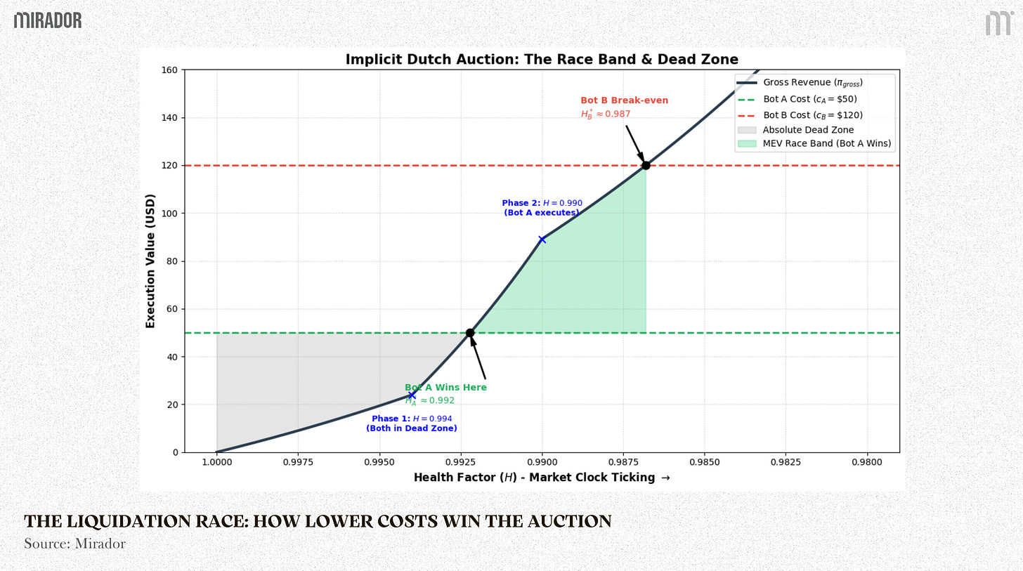 Bot B never gets the chance to liquidate. Because Bot A has a superior cost structure, it mathematically wins the Dutch Auction by intervening at a higher 𝐻 (a shallower risk depth) where Bot B is still trapped in the Dead Zone. This mechanism forces liquidator bots to optimize infrastructure and routing efficiency, so the protocol can be secured earlier with less collateral seized than a late, deeper liquidation.