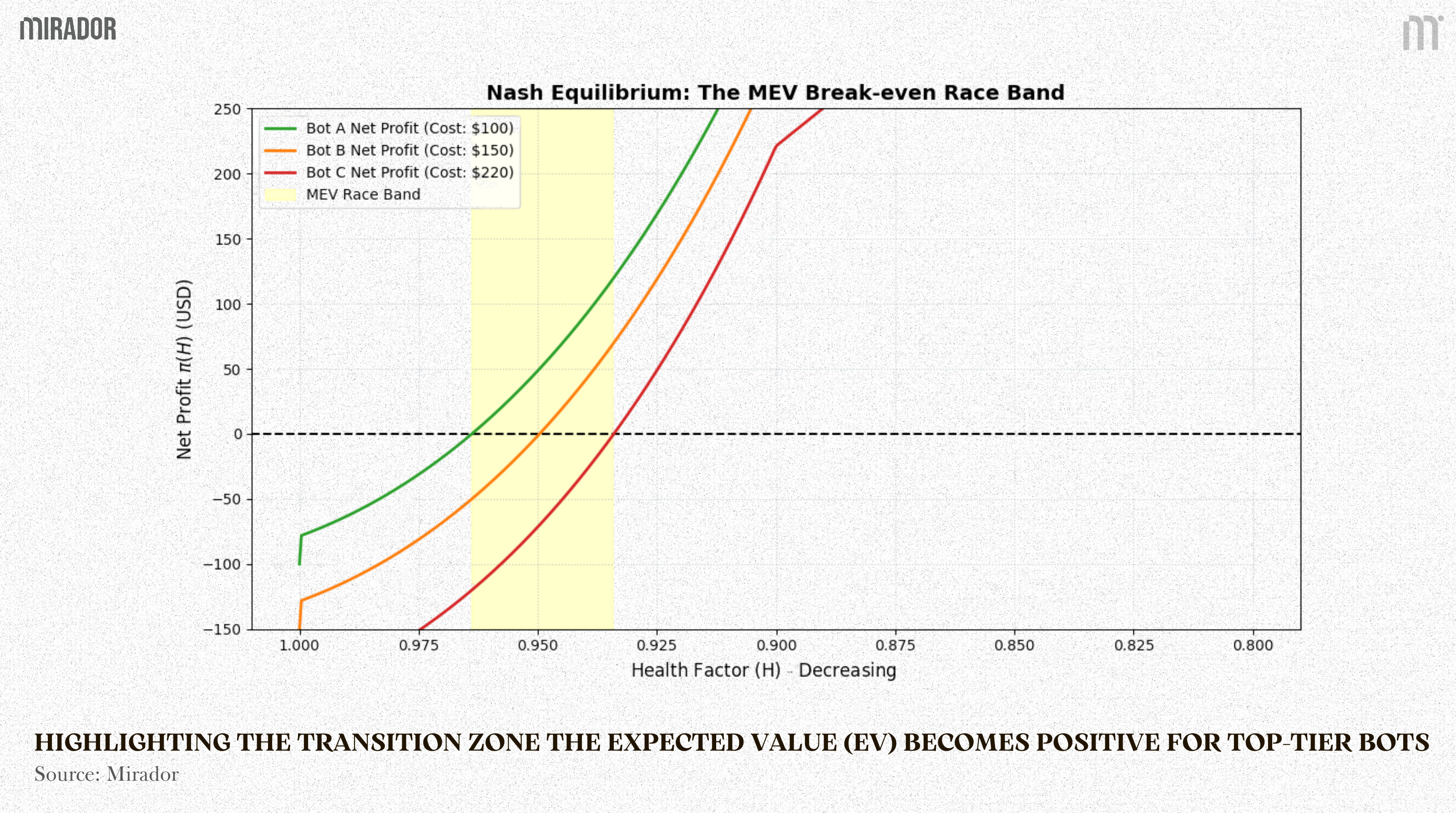 Mechanism definition: The Race Band is the range of 𝐻H where the most optimized tier of bots transitions from 𝜋(𝐻)<0 to 𝜋(𝐻)>0. In other words, it is the golden window where Expected Value becomes positive for top tier bots, but is still negative for the rest.