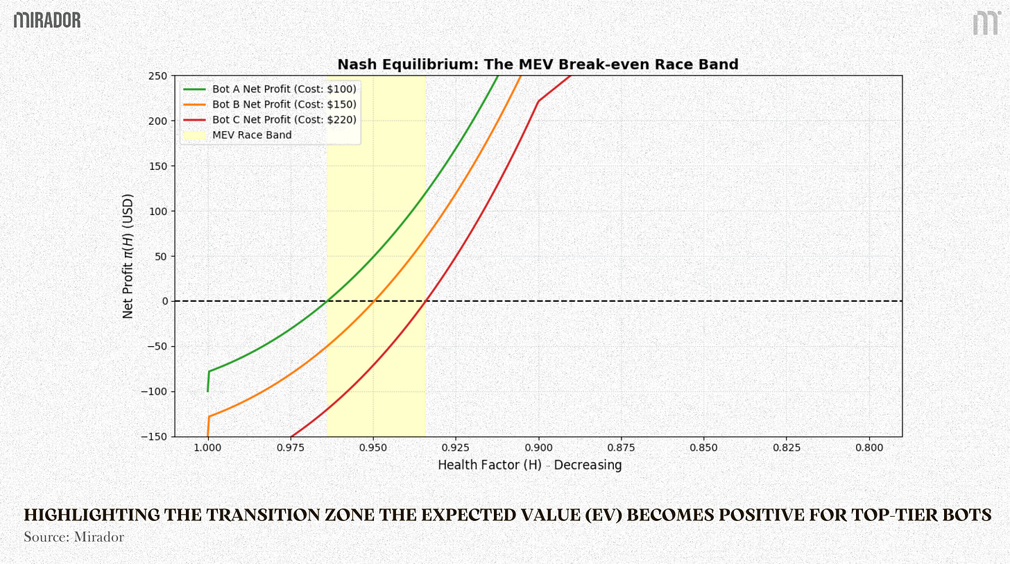 In this implicit auction, a bot effectively bids through its cost structure by signaling: I will execute as soon as the public reward covers my private cost. A bot with better routing or private orderflow has a lower 𝑐_𝑖, so it can execute earlier at a higher health factor where the bonus is still lower, but profit is already positive for that bot.