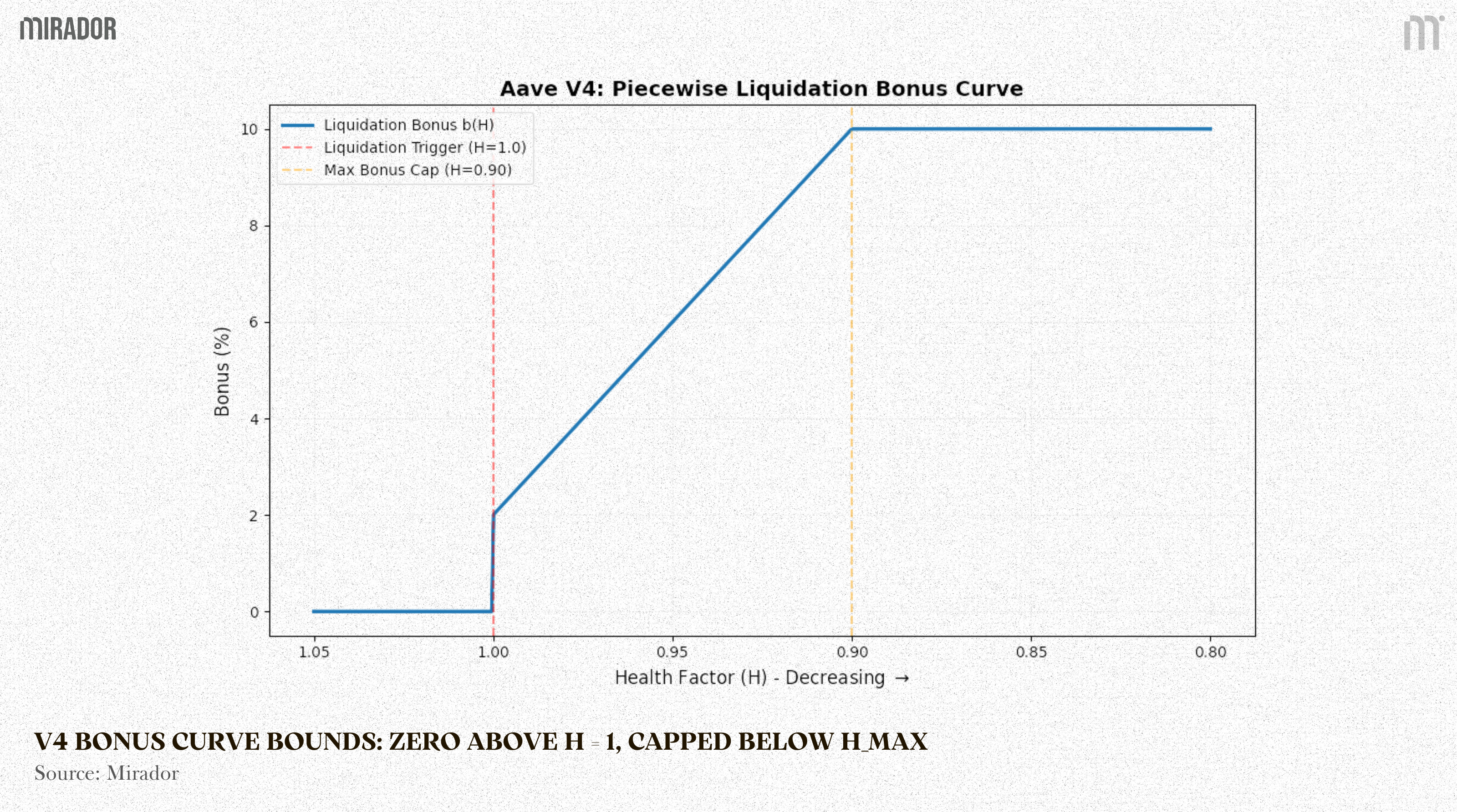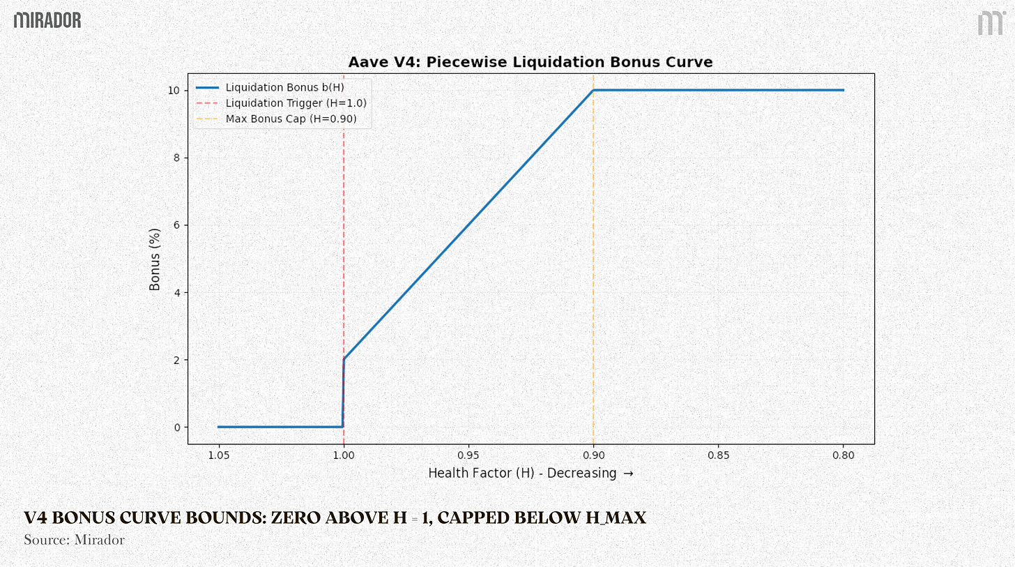 The mathematical bounds of the V4 piecewise liquidation bonus curve, illustrating zero incentive above H=1.0 and a strict cap below H_max.