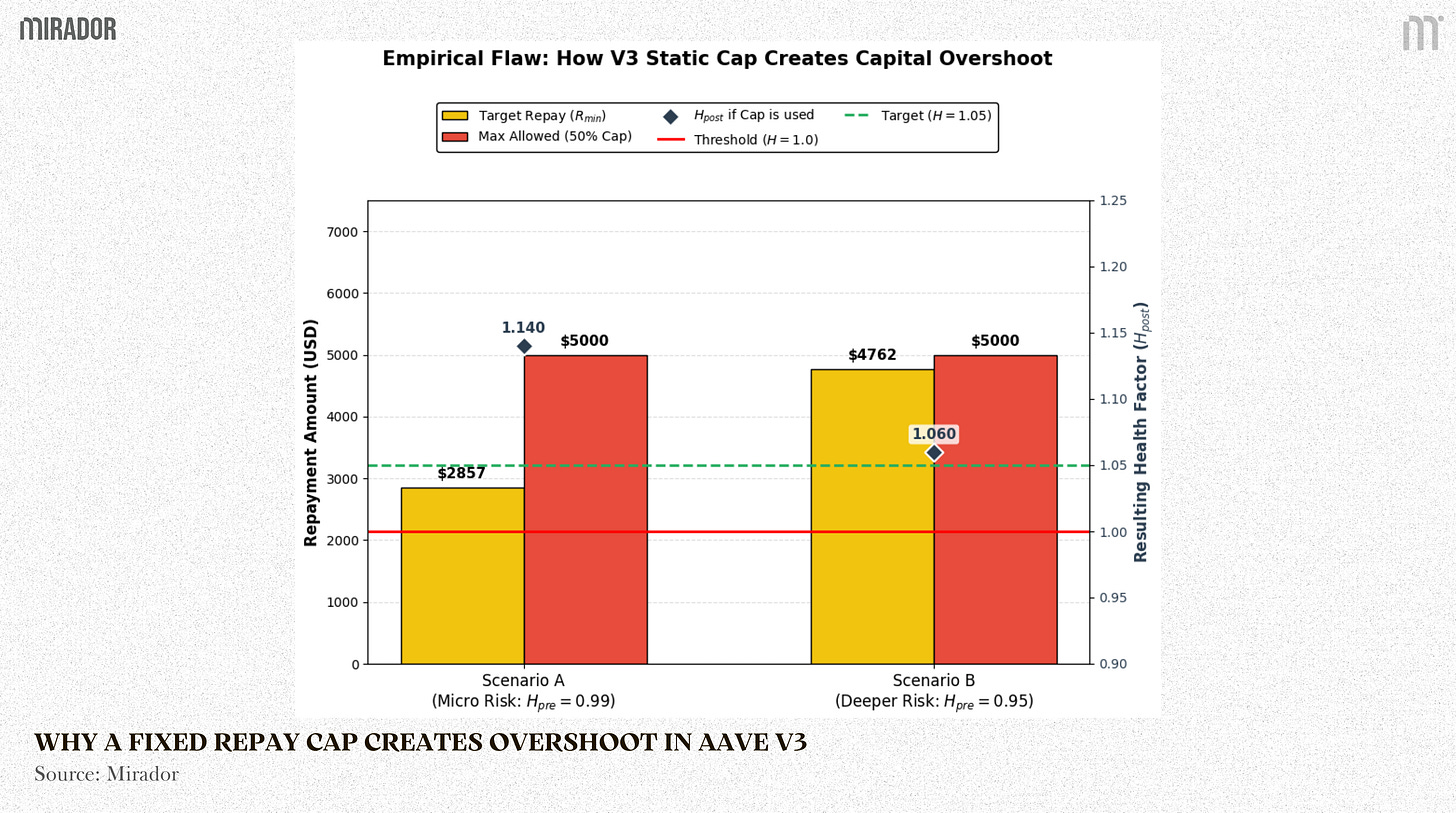 The key point is not that a higher post liquidation health factor is always bad. A buffer above 1.0 can be desirable, especially for volatile collateral, because it reduces the chance of immediate re liquidation. The issue in Aave V3 is that this buffer is not explicitly targeted by the protocol. It emerges mechanically from a coarse close factor cap and profit maximizing liquidator behavior. In Alice’s case, repaying the full 50% pushes the position from H=0.98 to H=1.12, which may be a larger buffer than necessary for a marginal breach, and therefore increases collateral sold and the liquidation penalty paid.