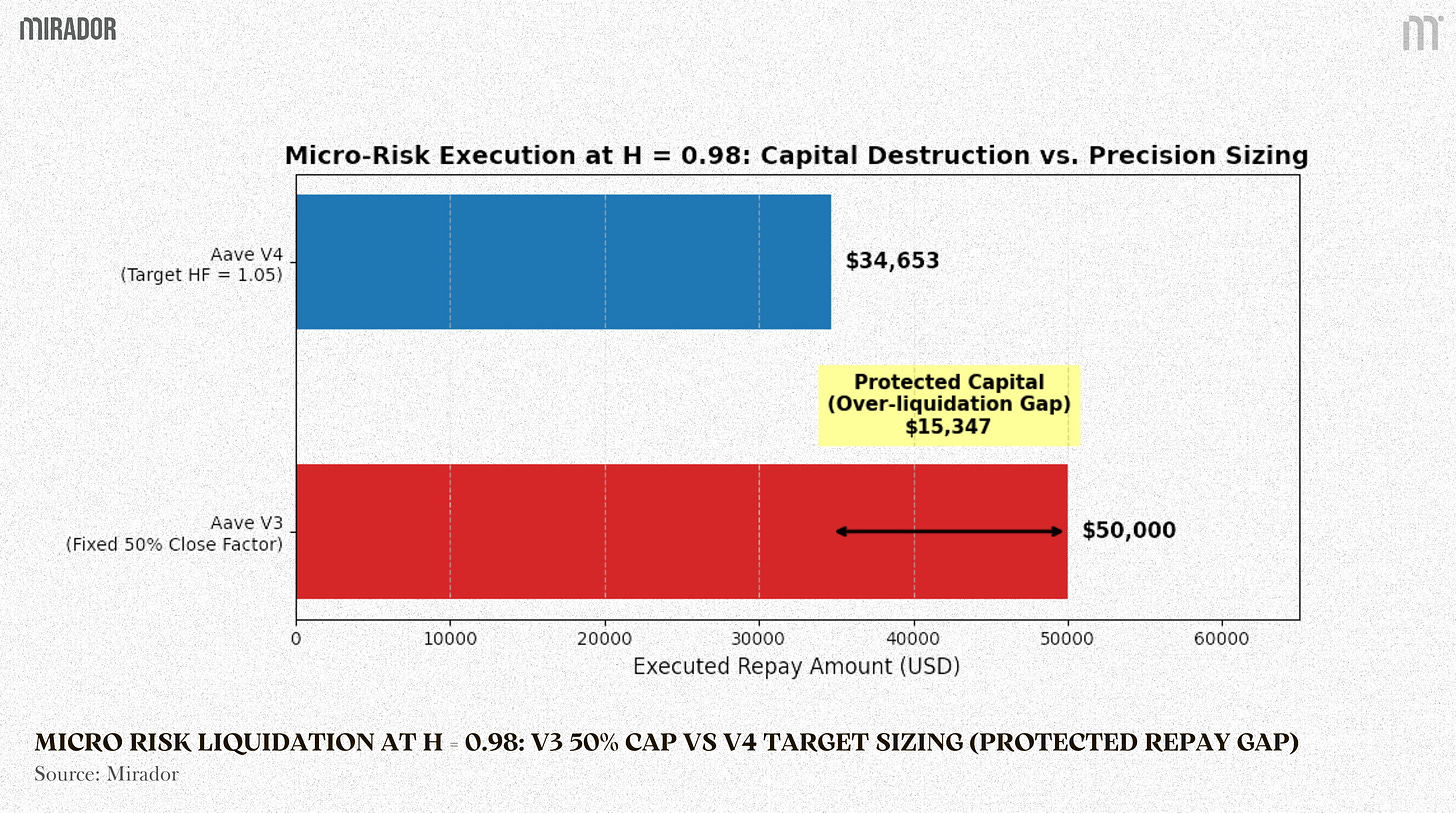 Capital Efficiency: It completely eliminates the capital destruction zone inherent to the V3 50% Close Factor’s over-liquidation logic. This maximizes user asset protection, preventing excessive capital seizure during micro-violations.
